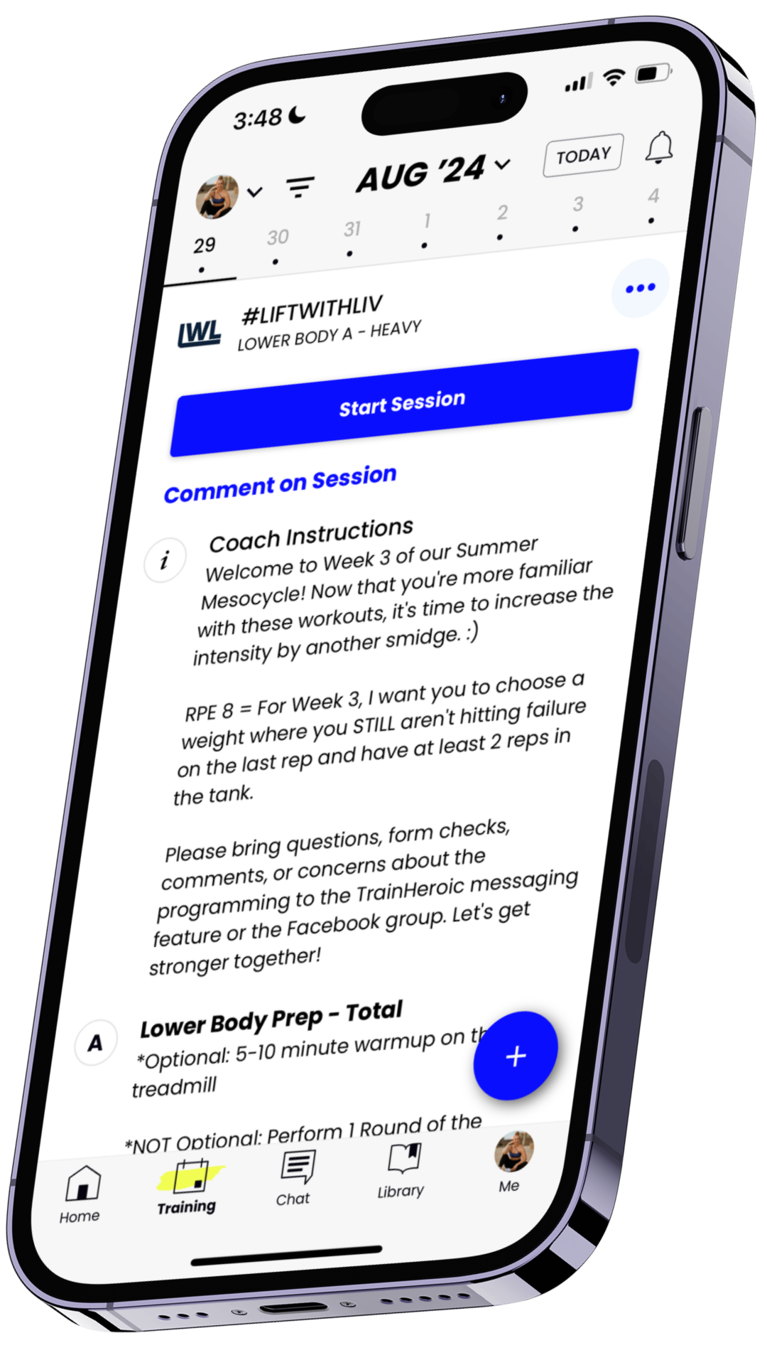Upon signing up, you’ll be prompted to download the LIFTWITHLIV training app via TrainHeroic, fill out your intake form, and join the Circle Community.